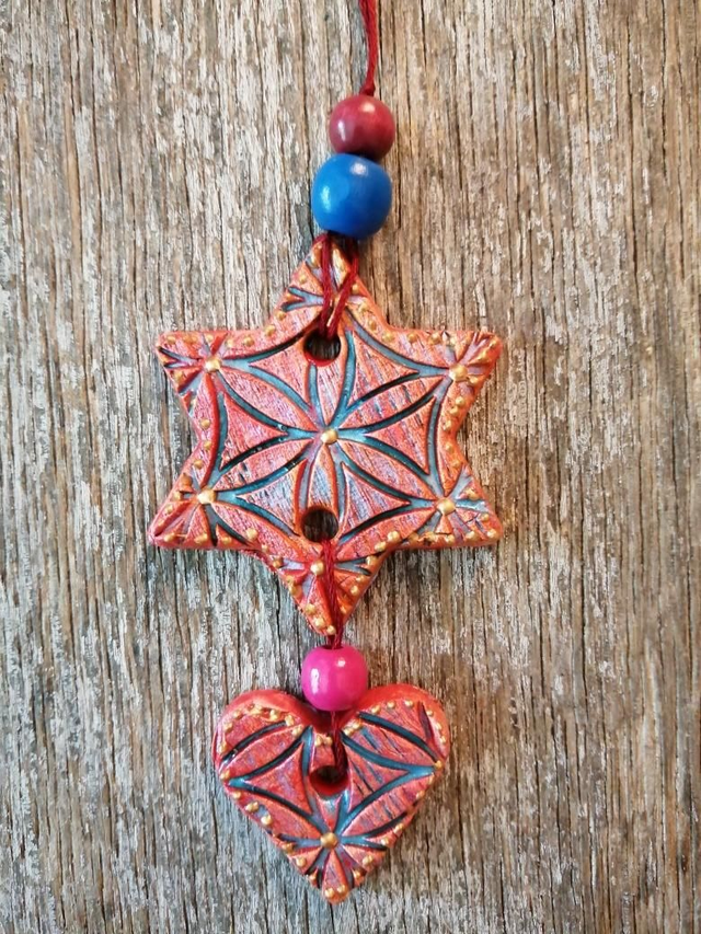 A completely unique decorative hanging. Handmade from air drying clay with flower of life impression, painted and finished with wooden beads. Suitable for indoor use.